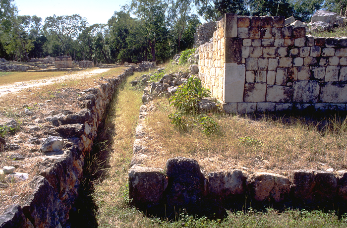 Trench between raised sacbé at left and low building platform at right, looking south to Central Plaza.    Jan. 2003 (24 mm lens)