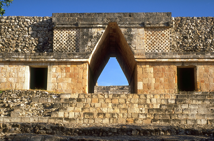 Main entrance to Nunnery Quadrangle, looking from outside in; facade at left of archway and room to left much restored.