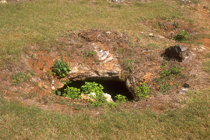 Sayil, in front of Great Palace. Mouth of chultune in photo at left; one of some 300 chultunes at Sayil.      Nov. 1999