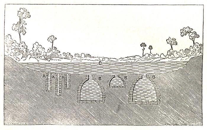 Detail of print at left. Aquada at rancho of Jalal, hypothetical cross-section of six of some forty wells discovered, cleared out and repaired by local inhabitants ten years previous to Stephens and Catherwood's visit, based on local reports. Scanned from Stephens, Incidents of Travel in Yucatan, 1843; Vol.II,  p.227.