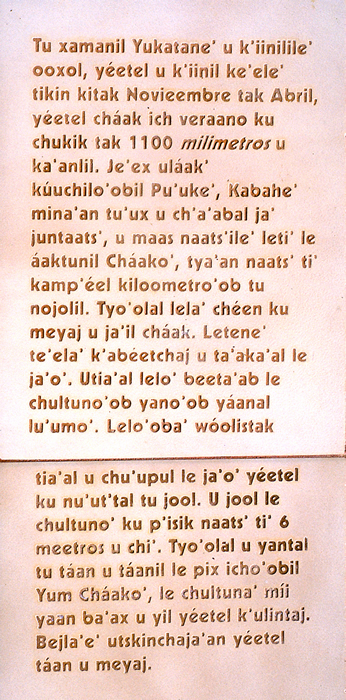 Detail of INAH plaque in photos above; Yucatec Mayan description. Jan. 2003