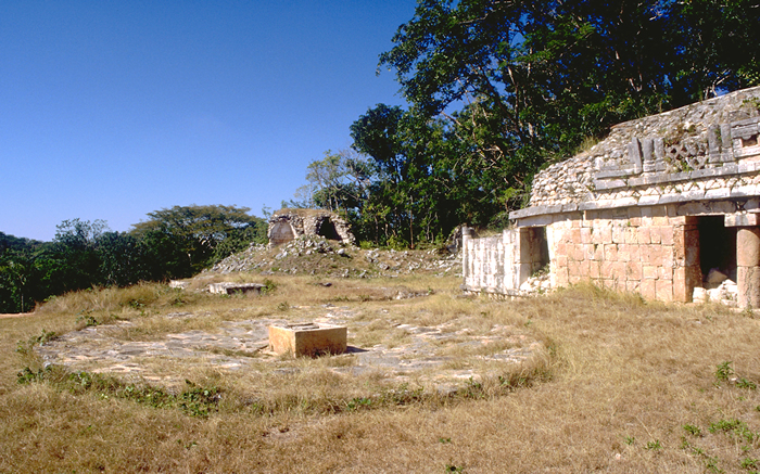 Labná, Palace Group, Upper Level. Chultune with large, circular catch basin in front of east structure, unusual because it is almost over rooms below.     Jan. 2003 (24 mm lens)
