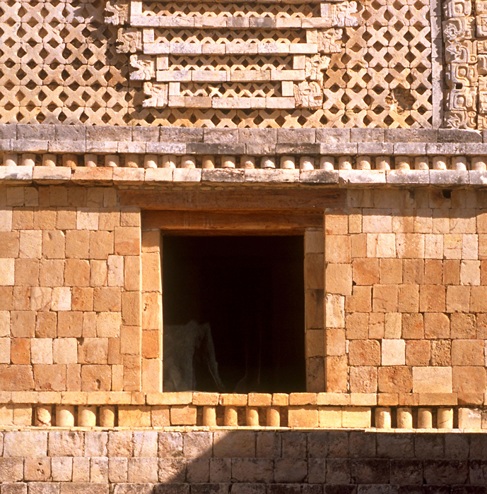Uxmal, Nunnery, East Building, Main (west) Facade. Doorway farthest right, narrower than central doorway (cf. photo at right) but similar to other doorways on facade. Recent wooden lintels and doorway inset.       Jan. 2002