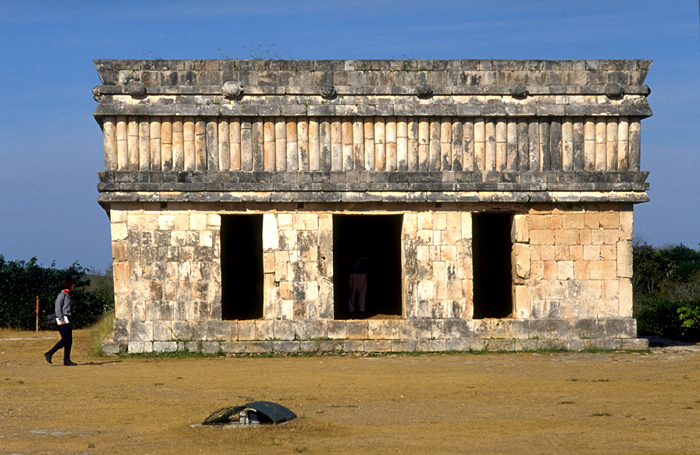 Uxmal, House of the Turtles, East End. Unusual to have 3 doorways in so short an end wall, the size and spacing sensitively varied.       Jan. 2001