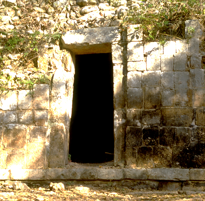 Sayil, South Palace, Back (north) Facade. Doorway farthest right, exceptionally narrow and tapered toward top.       Jan. 2001