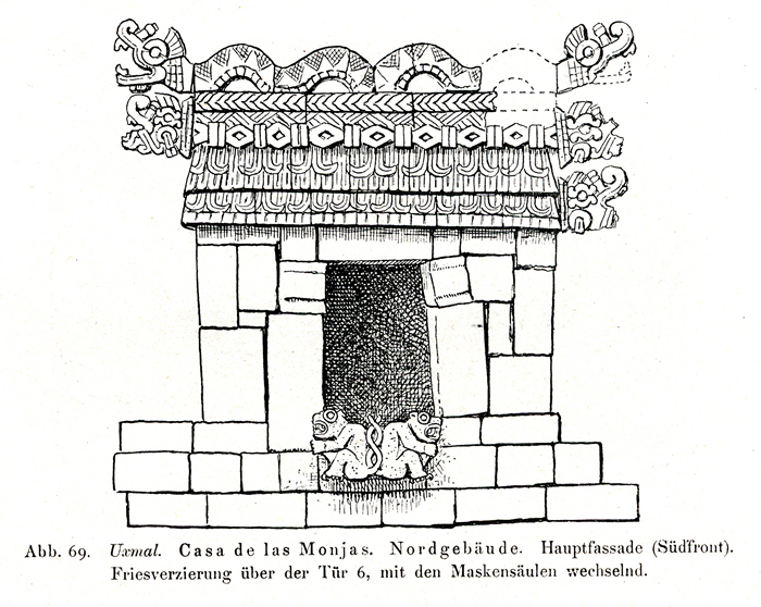 "Fig. 69. Uxmal. House of the Nuns. North building. Main facade (south front). Frieze decoration above door 6, alternating with the mask columns."