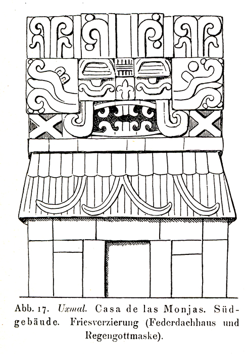 "Fig. 17. Uxmal. House of the Nuns. South building. Frieze decoration  (feather roof house and rain god mask)."