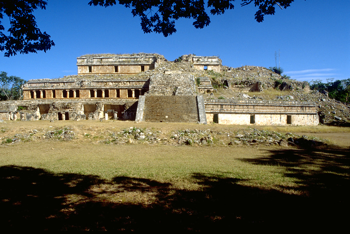 The Great Palace; originally with 94 rooms, one of the largest Maya palaces; much more of the left half has survived and been restored than the right half.   Jan. 2003 (24mm lens)