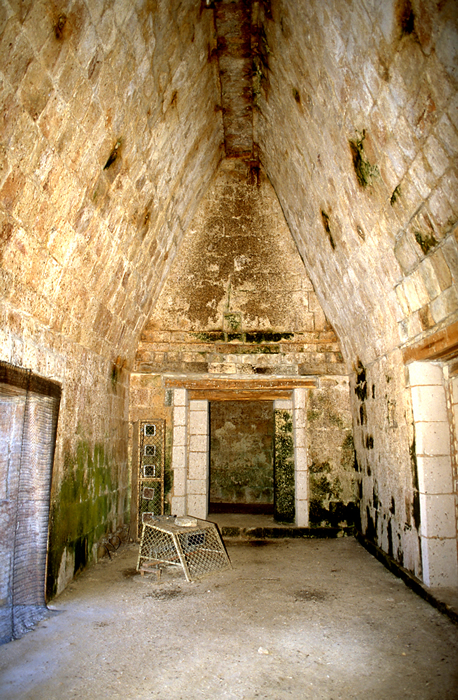 2003. Same view as in 1843 print at left. The relatively straight vault shape is unusual for Puuc interiors, but common in major Uxmal buildings.