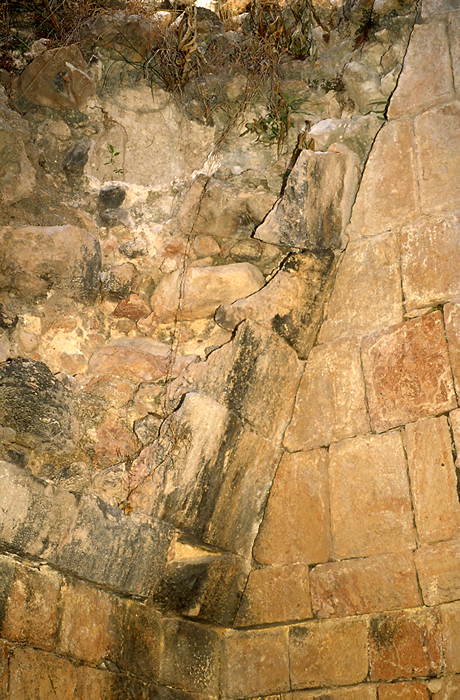 Concrete-rubble core exposed by fallen surface stones; detail of vault in other room.        Jan. 2001