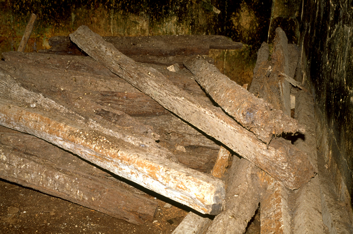 Decayed wooden lintels, possibly originals, removed from doorways, stored in room on south side of South Building.       Jan. 2001 (flash)