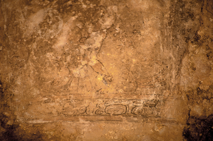 Best preserved (lower half) portion of painted capstone in inner-back room of Building Y, at right of grand staircase. This capstone includes a glyph for Lord B or Chak, and a date probably comparable to A.D. 9 Aug. 907.