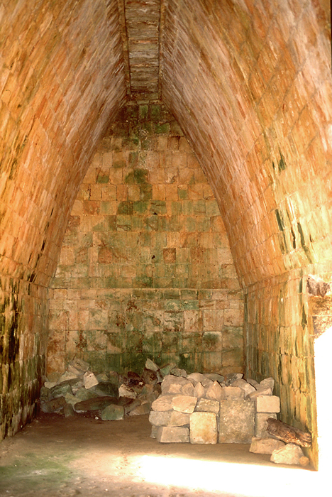 Closer-up view of area in photo at left; vault shape concave as in most Puuc interiors.       Jan. 2002 (flash)