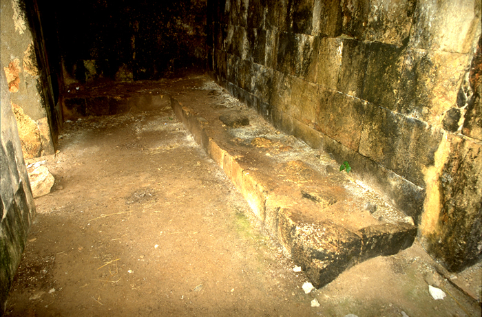 Stone bench in photo at left, formed of facing stones with concrete-rubble fill, surfaced with plaster.       Jan. 2003 (24mm lens)
