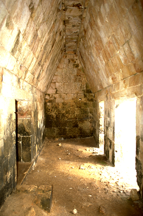Opposite view of same room, showing 2 of 3 exterior doorways at right, doorway to interior back room at left.    Jan. 2003 (24mm lens, flash)