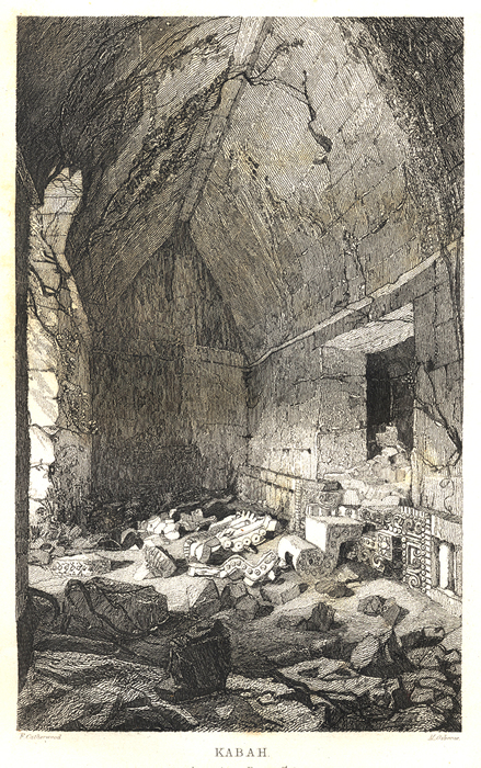1843. Same view. "Kabah. Interior of Centre Room 1st Casa / F. Catherwood, M. Osborne".  Comparison shows that lithograph at left was slightly glamourized.
