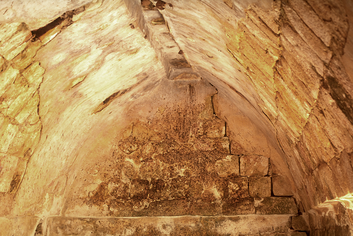 Labná, Palace Group. Interior of room inside doorway at left (west) end, showing concave soffit walls, crack separation in end wall.
