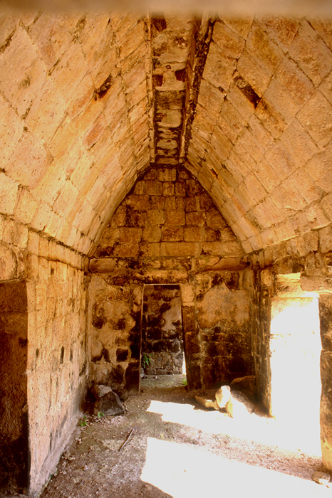 Sayil, Great Palace, Mid-Level, Interior of room farthest left. Looking through narrow end door to room with staircase; visible beam holes near top.        Jan. 2003 (24mm lens)