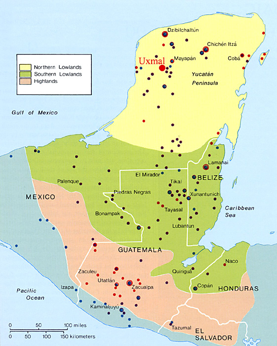 The 3 major Maya regions: Northern Lowlands, Southern Lowlands, and Highlands, with location of archaeological sites and modern national boundaries.