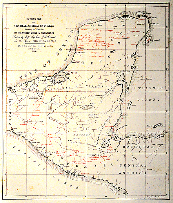 1844. Catherwood. "Outline Map of Central America & Yucatan, Shewing the Situation of the Ruined Cities & Monuments Visited by Messrs. Stephens & Catherwood. In the Years 1839, 1840, 1841, 1842. The dotted red line shews the route. F. Catherood. 1844."