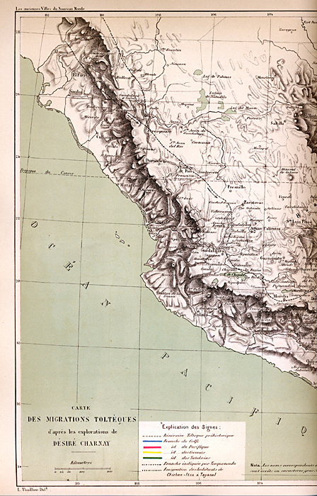 1885. Charnay. "Carte des Migrations Toltèques d'apres les explorations les Désiré Charnay". Left side of map.                                                                 Foldout print in Claude Joseph Désiré Charnay, Les anciennes villes du nouveau monde: Yoyages d'explorations du Méxique et dans l'Amérique Centrale par Désiré Charnay 1857-1882. Scanned from a copy in the Central Washington University Library, with appreciation.