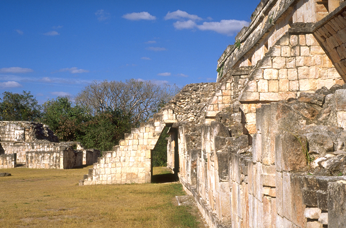 Palace: looking north along front of ground level, showing restored staircase and half vault underpass ("flying staircase").      Jan. 2001