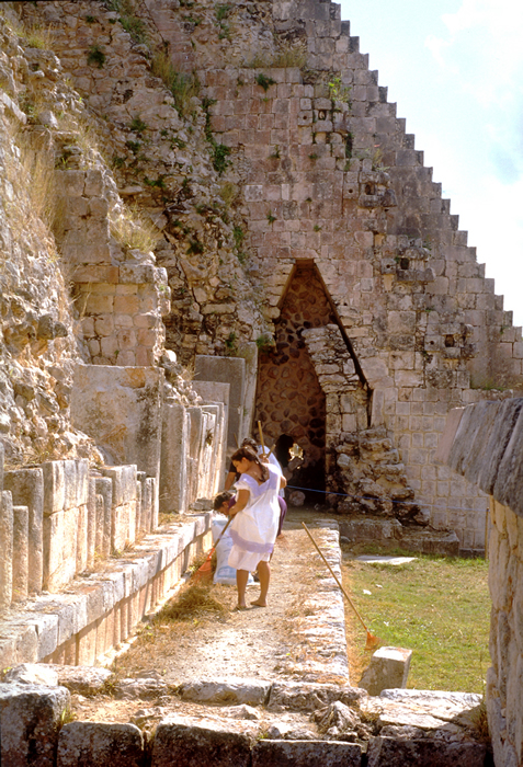Opposite view of lower portion of same, west staircase, showing original passage behind staircase; recently filled in to prevent collapse after severe 1988 Hurricane Gilbert.       Jan. 2002
