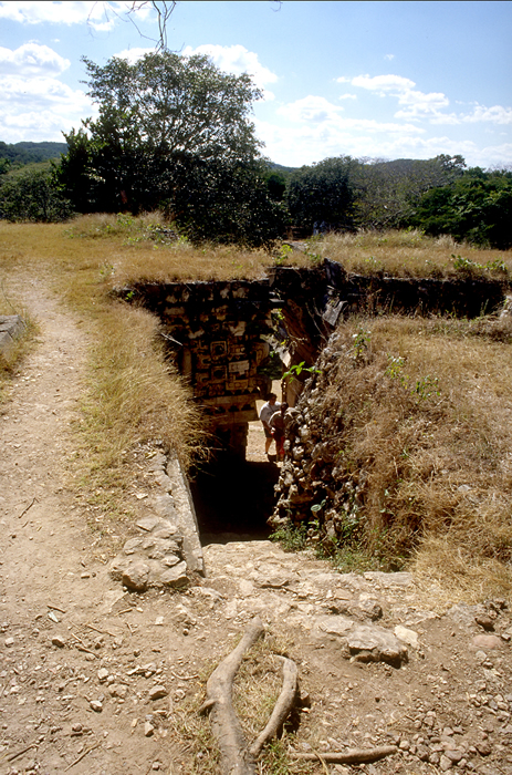 Labná, Palace group. Looking down from terrace on upper level, stairwell restored 1991-1992.       Jan. 2003 (24mm lens)