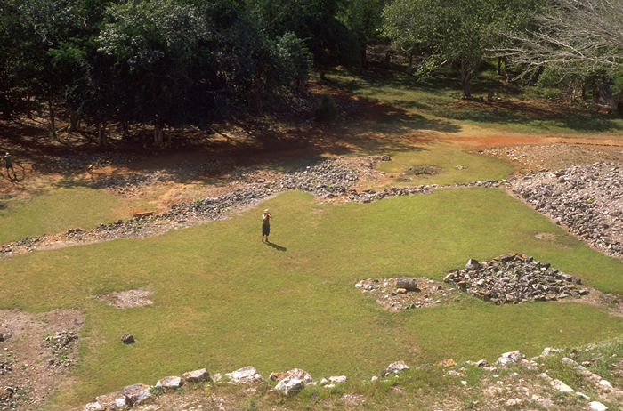 Looking down on low platform with broken altar, chultune on platform at extreme right; chultunes beyond platform in distance-right.      Jan. 2002