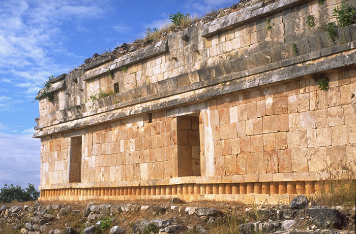 Upper level; most surfaces left plain; areas above doorways restored; tenons project indicating support for decorative motifs and/or figures, and break in cornice indicates that these projected above roofline.       Jan. 2001