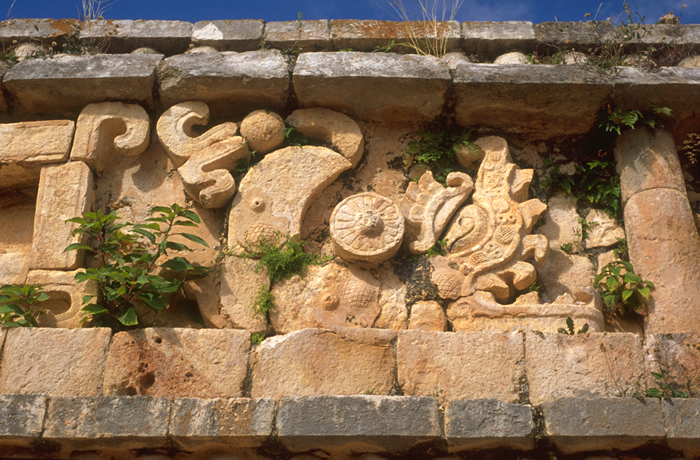 Sky serpent to right of Diving God in photo at far-left, showing open mouth with turned up lip.       Jan. 2001