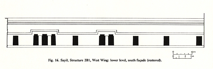 "Sayil, Structure 2B1, West Wing: lower level, south facade (restored)."