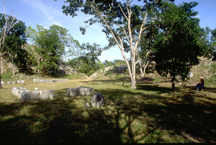 Looking northeast to depression between north and east building mounds, now used as passage into courtyard.