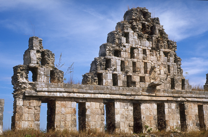 2nd (largely collapsed) and 3rd gable-shaped sections, west-to-east; showing projecting tenon which presumably originally held stucco figure.