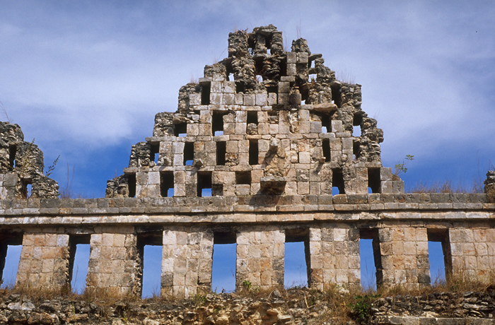 3rd gable-shaped sections, west-to-east; showing projecting tenon which presumably originally held stucco figure.