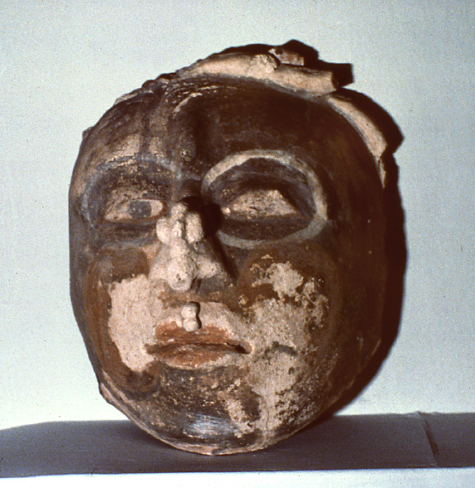 Painted stucco head found in room of Governor's Palace Scanned from original 35mm slide in Pre-Columbian Collection, Dumbarton Oaks; Reprooduced Courtesy of the Peabody Museum of Archaeology and Ethnology, Harvard University.