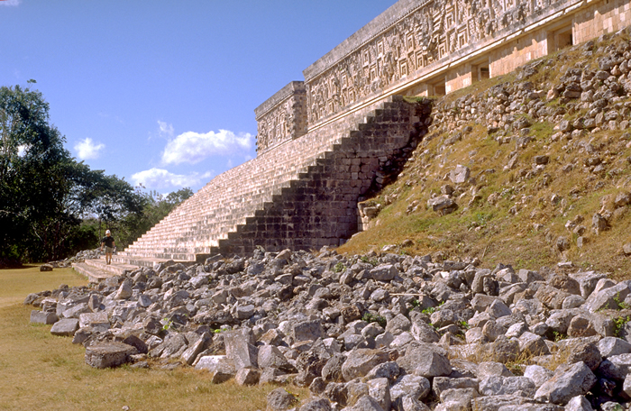 Slightly less than a profile view of Grand Staircase, collapsed stones of Governor's House Platform in foreground.