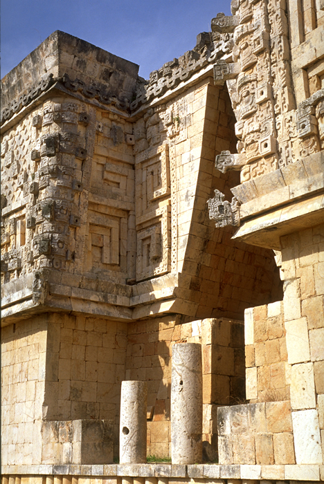 Front entry to left (south) vaulted passageway. Like all 6 front corners of the medial molding, these 2 corners are marked with serpent heads with open mouths. Jan. 2001