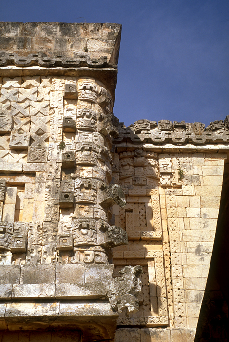 Detail of left area seen in photo above-left. Above corner serpent head are 5 corner masks with snouts mostly broken. Jan. 2001