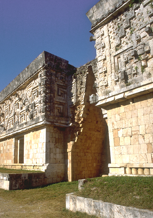Front entry to right (north) vaulted passageway. Like all 6 front corners of the medial molding, these 2 corners are marked with serpent heads with open mouths.