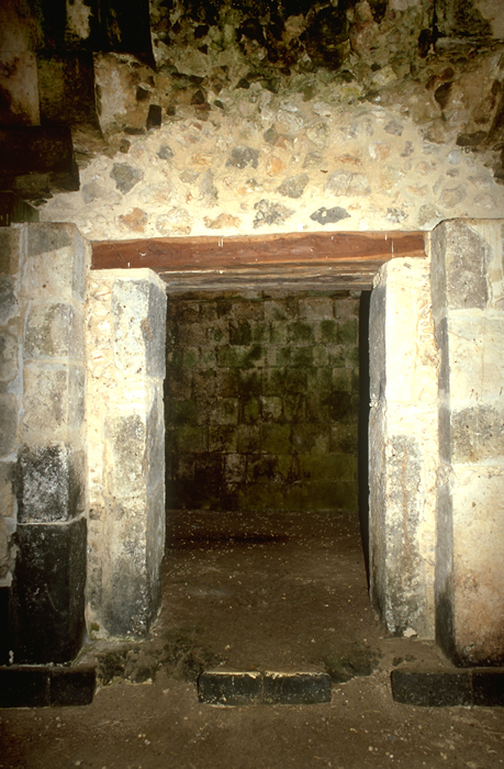 Showing low step up to back, interior room, bordered with facing blocks, filled with concrete rubble, then surfaced with plaster.