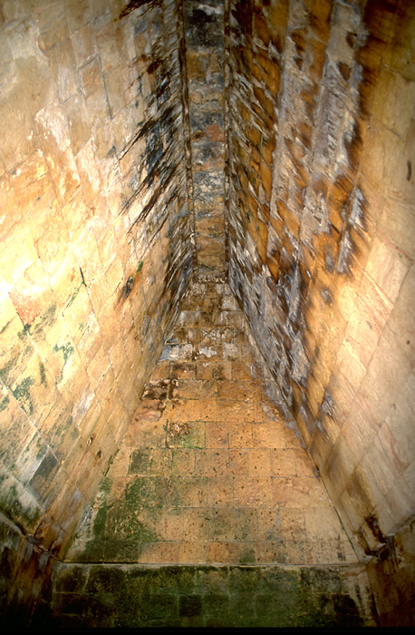 Detail of photo at left, showing sockets for two cross-beams at bottom of each side of vault Jan. 2003 (24mm lens, flash)