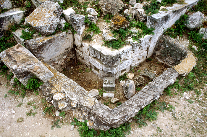 Partially excavated mask at northwest corner of building platform; jaw with teeth presumably below ground. Jan. 2003 (24mm lens)