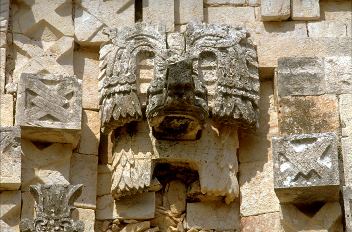 Feathered headdress of figure (missing) above doorway farthest left, south wing; above a serpent head with snout here seen straight on. Jan. 2001