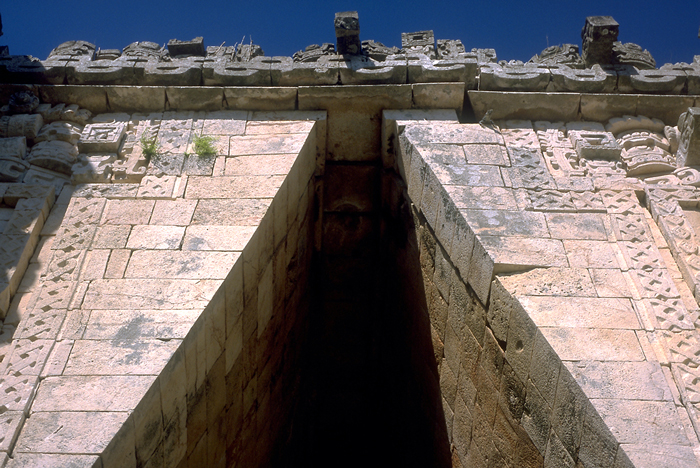 Sides of passageway are slightly convex, suggesting enormous drapes, a unique feature within Maya architecture.