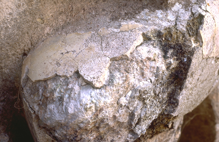 Detail of knee in photo at left; rare example of surviving plaster covering stone sculpture, also showing lack of finish to stone within. Jan. 2003