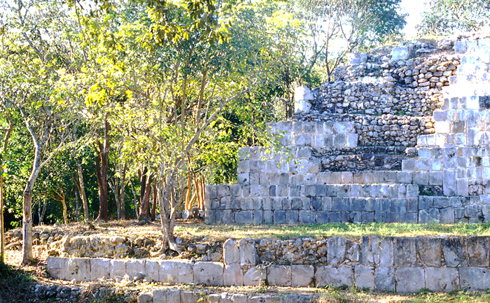Showing lowest platform in foreground, low with narrow grass terrace on top, and tall section of Great Platform, with several setbacks, above. Jan. 2001