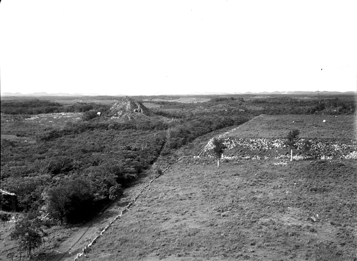 1936. Looking south, from top of Pyramid of the Magician, to Pyramid of the Old Woman, left, and east end of the Great Platform, recently cleared.