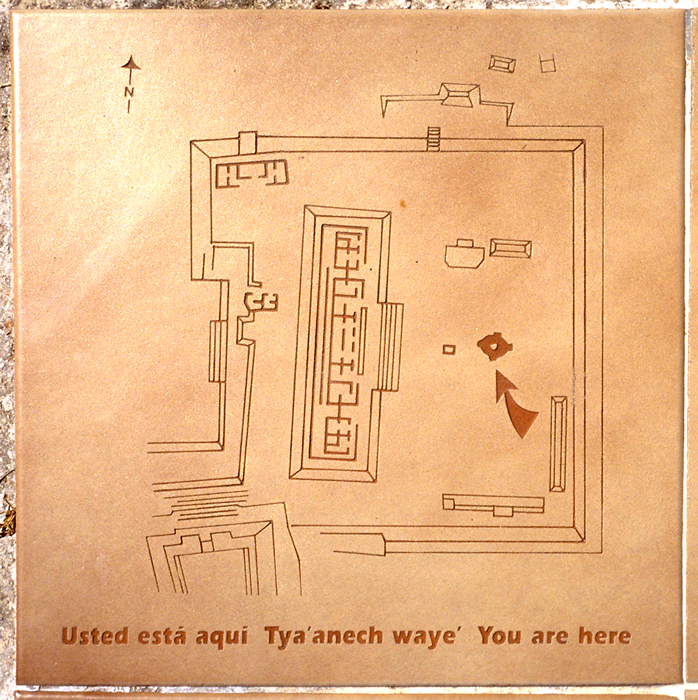 Detail of plaque at far left; groundplan of entire terrace on top of Great Platform; arrow indicates location of Two Headed Jaguar Throne.