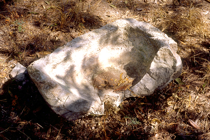 Damaged metate (used to grind corn) beside east side of Great Platform.